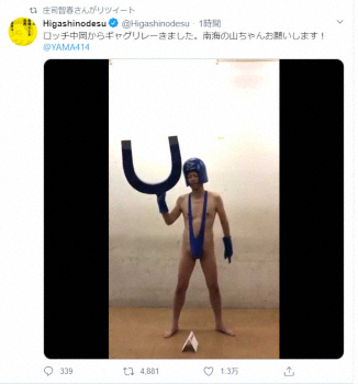 《東野は伝説コントキャラ「S極」に》5日は狩野英孝(38)らにバトンがつながった。ロッチ・中岡創一(42)は「Tシャツ1枚でレオタードマン」のギャグを披露し、次に東野幸治(52)を指名した。東野は「ダウンタウンのごっつええ感じ」で今田耕司(54)と組んだ伝説のコント「放課後電磁波クラブ」のキャラクター・S極として登場。際どい男性用ビキニ姿で体を張り「人類VS新型コロナウイルス」の戦いに人類が勝つという芸を披露した。