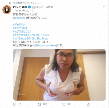 先月27日に筋肉自慢の庄司が「マッチョ売りの庄司」というネタを投稿して開始。次にギャグをする人を指名するスタイルで、ペナルティのワッキー(47)やFUJIWARAの原西孝幸(49)、ガリットチュウの福島善成(42)らが続いた。