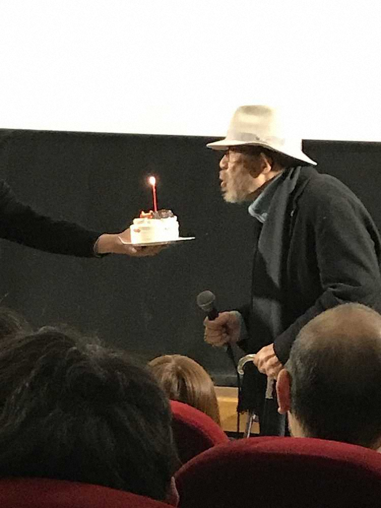 「花筐/HANAGATAMI」の舞台あいさつを同市内で終えて駆けつけ、「(当時使用した)車椅子を降りる。お客さんの前で車椅子は失礼」と訴えたという。舞台上で、80歳の誕生日ケーキを手配するとロウソクを吹き消し、「予定時間を超えて話してもらった。“ここにいる”とおっしゃってるみたい」と振り返った。