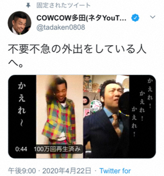 お笑いコンビ「COWCOW」の多田健二(45)が22日午後9時に自身のツイッター、インスタグラム、ユーチューブ「COWCOW公式チャンネル」で一斉配信した「不要不急の外出をしている人へ。」と題するメッセージソング「Go home!」が24日、ツイッターで100万回表示を突破した。