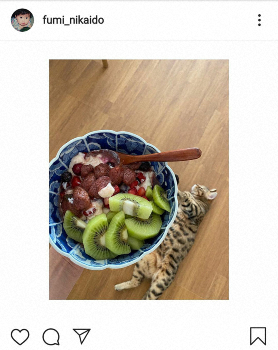 「今日のおやつ」として「豆乳ヨーグルトにフローズンベリーやら苺ジャムやらキウイやら。下にはナッツも隠れてる」と、おいしそうなデサートを撮影したものだが、二階堂の手と床の色が似ていることから、床に寝転んでいる猫と同じ大きさの器が宙に浮かんでいるようにも見える。