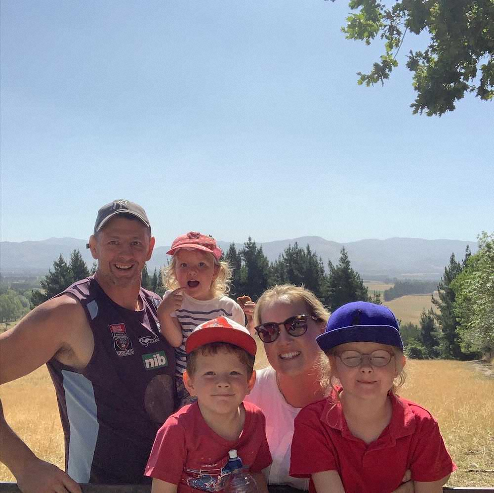 ニュージーランドでの生活を紹介するトンプソン・ルーク(左)。妻ネリッサさんと3人の子供