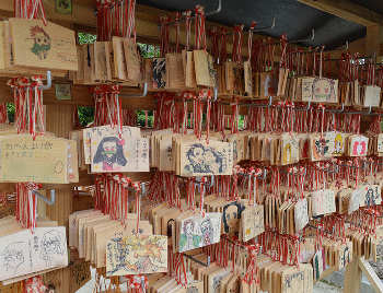 竈門神社の境内にはファンが描いた登場人物入りの絵馬がズラリ。「滅コロナ」「さよならコロナ」など、ウイルス退散を願って書き込まれたものも多い。