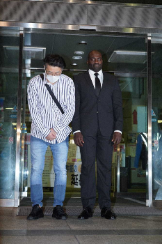 関係者と謝罪するボビー・オロゴン容疑者(右)(撮影・会津 智海)