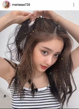 「ゴム2本でできる簡単すぎるヘアアレンジ」として、ヘアゴムを使って髪を結ぶ様子を動画でアップ。「かわいい加工みっけ」とも記し、髪に花柄をあしらった加工画像も掲載した。