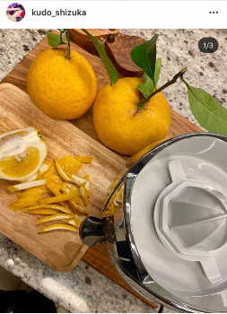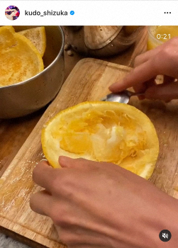工藤は「この季節になると飲みたくなります 私は蜂蜜を入れて飲むのが好きです」と柚子の写真をアップ。「手間はかかりますが、柑橘の皮ジャムを作っておくと、ケーキやお料理に重宝しす。。。皮は3回茹でこぼしをしてから、調理を始めます。皮だけどとなんとなく寂しいので少し果実も入れますが、柑橘のジュース、林檎ジュース、てんさい糖などを入れます。甘めが美味しいです お好きな味に」と写真と動画で作る様子をアップした。