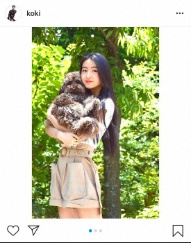 Koki,は英文で「Shorts from @diamonddazzleofficial」とショートパンツで愛犬を抱っこする姿など、ナチュラルな表情を見せる3枚の写真を投稿。カメラのイラストに「by sis」と添え、姉のCocomiが撮影したものであることを示した。