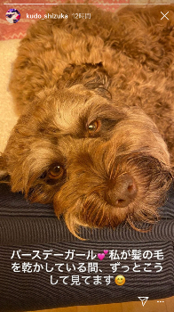 工藤はストーリーで「バースデーガール」と愛犬の誕生日を祝福。「私が髪の毛を乾かしている間 ずっとこうして見てます」とトロンとした表情で見つめる愛らしいアムちゃんの写真を投稿した。