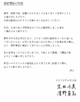 私共、生田斗真と清野菜名はこのたび結婚致しました事をご報告させて頂きます。
