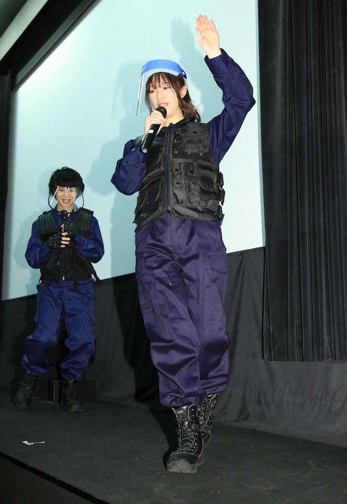 新型コロナウイルス感染予防のため、劇中衣装にフェースシールドを着けて登壇。シールドにマイクをぶつけて照れ笑いを浮かべる一幕も。それでも、怪獣攻撃隊のメンバーとして映画デビューを飾り「未知のものと戦う系の作品をやりたかったので、無事に公開されて凄くうれしい。撮影は(怪獣が)どこにいるんだろうと思いながらでしたが、大いに笑って、そして“食べて”ください」と手応え十分の様子だった。