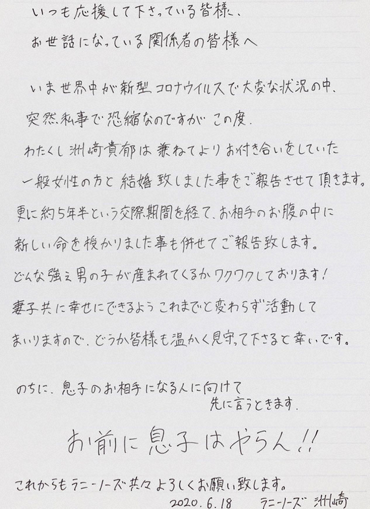 お笑いコンビ「ラニーノーズ」の洲崎貴郁 Photo by スポニチ ラニーノーズ洲崎 一般女性との結婚発表 お相手は妊娠6カ月のダブルおめ… ギャラリーで見る この記事のフォト 2020年06月18日の画像一覧 もっと見る 2020年06月18日の画像をもっと見る
