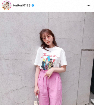 「#私服」のハッシュタグとともに「ちょっといかつい私」と記し、白のTシャツに鮮やかなピンク色のパンツをコーディネート。