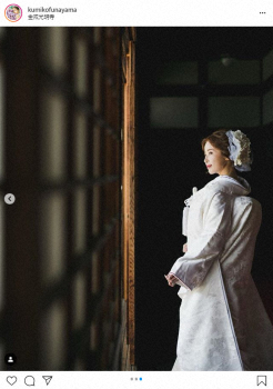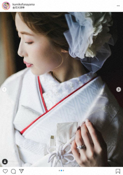 舟山は3枚の和装を披露。「人生初の和装です 着てみたかったけど式はドレスの予定だったので、こうやって着れて夢が一つ叶いました」と感無量の様子を見せた。