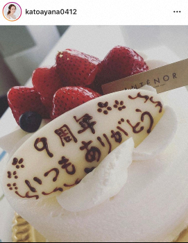綾菜は「9年記念日です 出会って11年目です」と記念日ケーキの写真を投稿。「カトちゃんが元気でいてくれるだけで幸せだと染み染み思う毎日です 世界一の旦那さんです」とのろけ、「皆んなのカトちゃんを支えていけるように頑張ります これからも、皆様宜しくお願いします」と