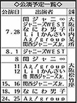 《8月には各グループが生配信ライブ》8月には、各グループが大阪・松竹座で生配信ライブを行う。1日のジャニーズWESTを皮切りに計10日間公演。今年3月に中止になった舞台「僕らAぇ!groupがbrakeしそうですねん?!」も開催。各グループが考案したオリジナルのライブも見ものだ。
