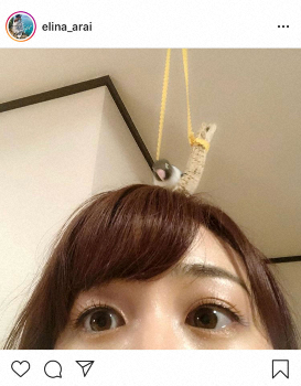 日頃からSNSでラピスとの戯れを公開している新井。「頭に乗っているのではないのです」とのコメントとともに、遠近法で頭の上に乗っているように見える愛鳥との2ショットを投稿。新井の顔は目から上しか映っておらず、見上げるような絶妙なアングルとなっている。