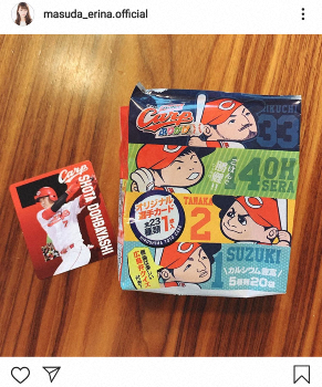 枡田アナはインスタグラムに「パパのカードget」と一言だけ報告し、両目がハートマークになった顔の絵文字を添付。「#カープふりかけ」とハッシュタグを付けた。「カープふりかけ」はオリジナル選手カード全23種類のうち1枚が封入されており、その外装とともに中から出て来た堂林カードの写真も添えている。