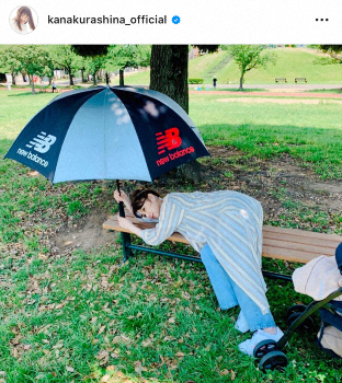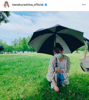 倉科は「暑い。。。。」と記し、木の下にあるベンチで寝そべり涼を取る姿や、芝生の上でマスクを着用し大きめの傘を差して日よけする姿をアップした。