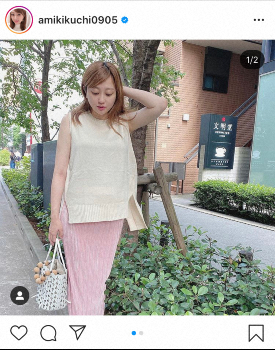 現在、第1子妊娠中で、夏頃に出産予定の菊地は「時間なくて起きて10分 ニットべスト意外と涼しい」とオフホワイトのニットベストと、ピンクのロングスカートを着た夏らしいコーデを披露。「前より美容院に行く頻度減ったから、すでに根元黒い 笑笑」とつづり、バックショットも公開した。