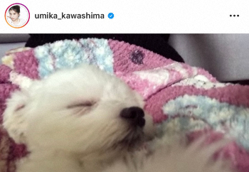川島は「わたくしが前髪ある頃の、癒し動画を発見した」と記し、腰掛けた自身の足元に愛犬が眠っている様子を動画で公開。撮影時に愛犬のアップを映そうとカメラを近づけると、犬が起きてしまい、カメラにこつんと顔をぶつけてしまった様子が映し出された。このハプニングについて「私が(撮影に使用していた)携帯あてたわけじゃないのよ~」と釈明しつつ「(愛犬が)察したのかな~盗撮されているのを~」と振り返った。