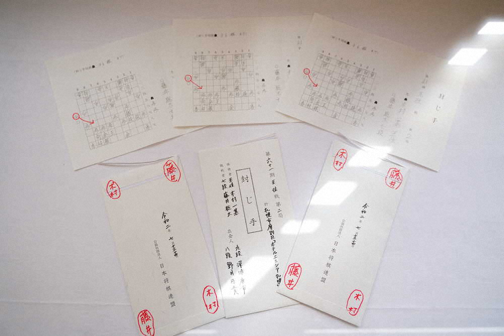 将棋の第61期王位戦7番勝負第2局第2日(14日=北海道札幌市)開始前に開封された藤井聡太七段(17)の封じ手。