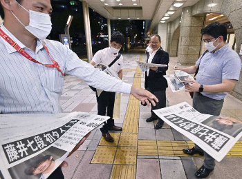 号外を食い入るように読む商店街の店主ら(撮影・岸 良祐)