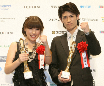 2009年2月、毎日映画コンクールでスポニチグランプリ新人賞を受賞しガッツポーズをする三浦春馬さん(右)。左は仲里依沙 Photo by スポニチ 三浦春馬さん死去 制作現場は大混乱 テレビ、映画、舞台少なくとも9本に… ギャラリーで見る この記事のフォト 2020年07月19日の画像一覧 もっと見る 2020年07月19日の画像をもっと見る