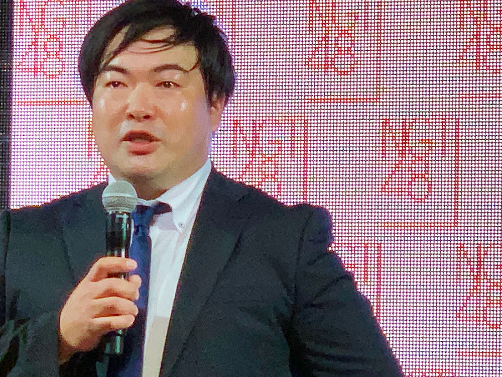 涙ながらに所信表明をするNGT48運営会社Flora岡田剛新社長