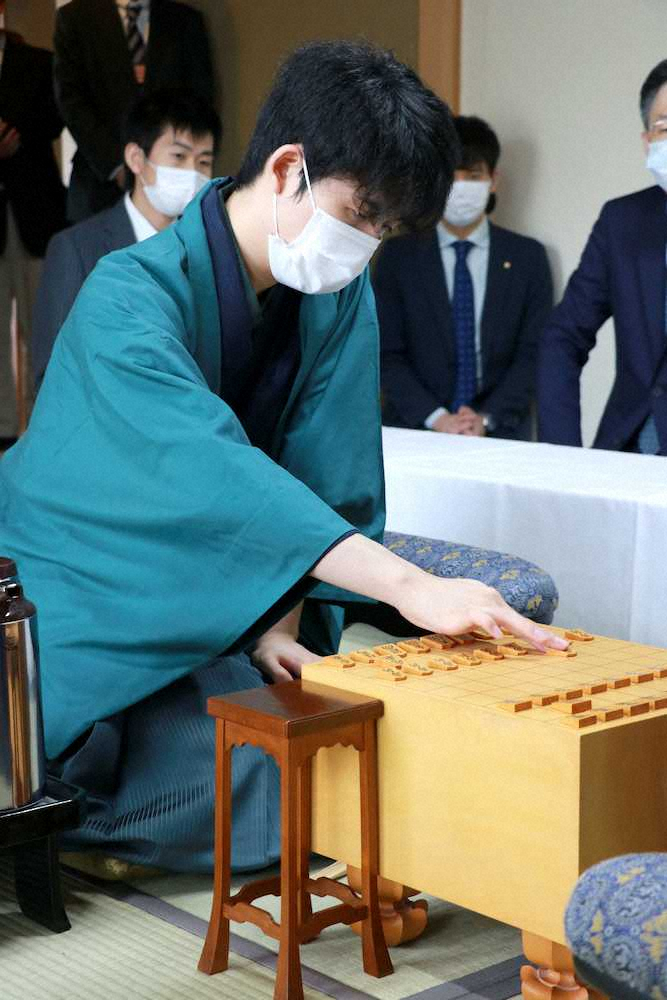 対局場には藤井、木村の順に入室した。和服姿の藤井は濃い抹茶色の紗紬(しゃつむぎ)を羽織り、中の着物は濃紺。この日のマスクは、棋聖戦で着用した後に話題となった絹製の通称“藤井マスク”ではなく、使い捨てタイプのようだ。