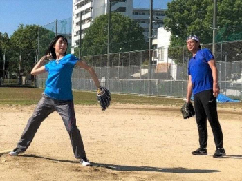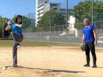 「オリックス対ソフトバンク」(3日、京セラドーム)でのプレ始球式に向け練習するNMB48・横野すみれ(左)と、指導する星野伸之氏