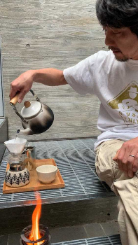 自作した5つのウッドガスストーブを並べる山崎まさよし