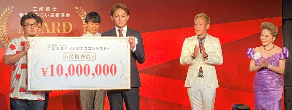 助成先の最優秀賞にはスイカ専門店で生計をたてることが夢だった佐藤洸さん(26)が選ばれ、プレゼンターを務めたデヴィ夫人は「若い方たちがいろんなことに着眼し、イマジネーションを持って研究し失敗も繰り返すと思うが、それを支援する三崎さんら審査員の方々は素晴らしい」と賛辞。「三崎さん、素晴らしいことをなさってますね。びっくりしました。また売名かと思いました」と三崎を苦笑いさせながらも絶賛した。