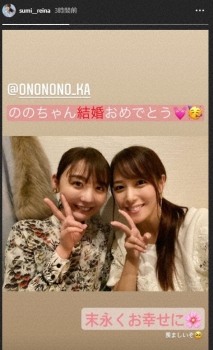 鷲見アナはインスタのストーリーズ機能におのののかとのツーショットを投稿。「ののちゃん結婚おめでとう」と友人を祝福し「末永くお幸せに」とコメントした。