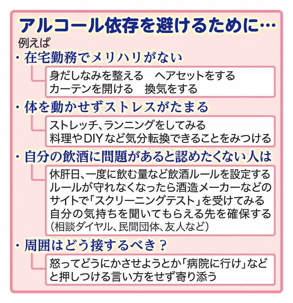 アルコール依存に詳しいワンネス財団の三宅隆之共同代表は「問題飲酒は、不安や恐れなどを払しょくする道具として酒を用いていることがほとんど」と指摘。「自分の飲酒に問題があると思えば、まず心の状態に目を向けて」と呼びかける。