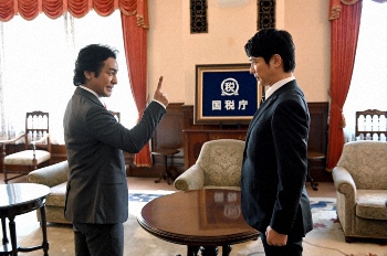 日曜劇場「半沢直樹」最終回。半沢(堺雅人)にアドバイスを送る黒崎(片岡愛之助・左)(C)TBS