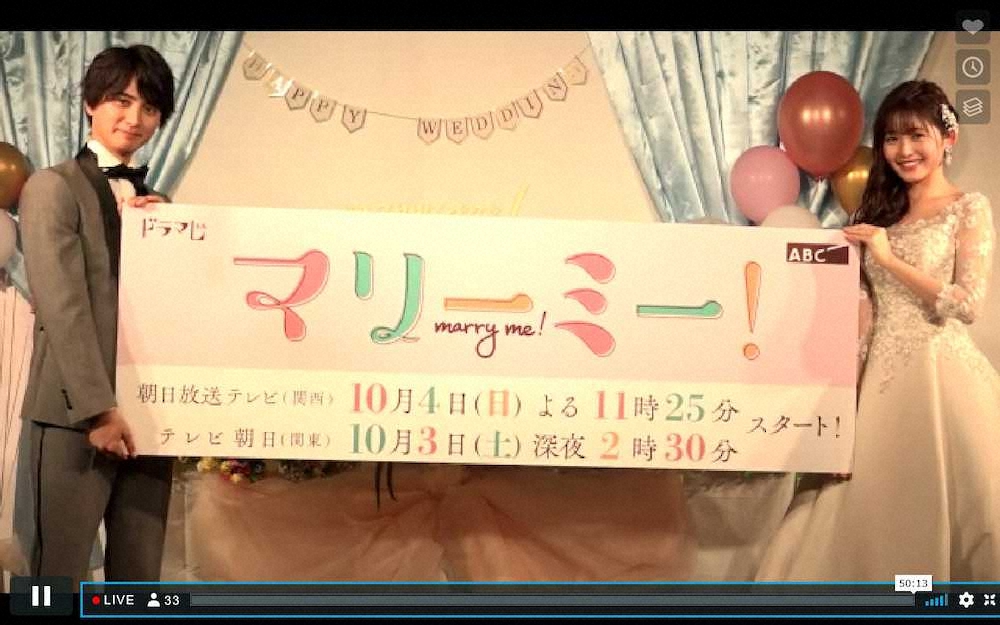 10月4日スタートのABCテレビ「マリーミー!」(日曜後11・25)の取材会がオンラインであり、地上波ドラマ初出演、初主演の久間田琳加(19)、夫役の瀬戸利樹(24)が撮影秘話を語った。