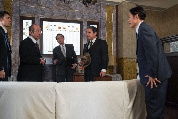 連続テレビ小説「エール」第34話。小山田(志村けんさん・左から2人目)の視線の先には…(C)NHK