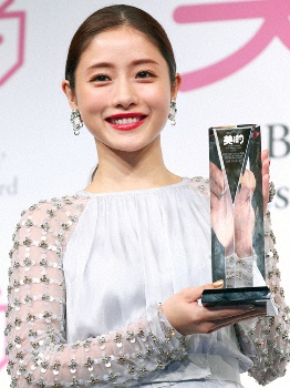 16年12月、美的ベストビューティウーマン賞を受賞しトロフィーを手に笑顔を見せる石原さとみ