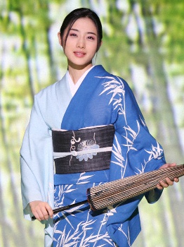 09年、着物ショーで、紺絽(こんろ)地染め分けに細竹を白で描きあげた訪問着で登場した石原さとみ