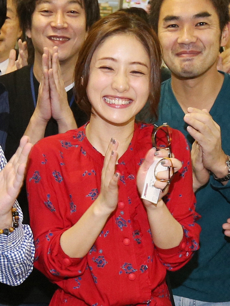 16年12月、スポニチ本紙が特別につくった紙面を手に笑顔の石原さとみ