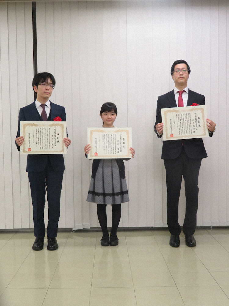 関西囲碁将棋記者クラブ賞を受賞した豊島将之竜王(左)と村川大介九段(右)と特別賞の仲邑菫初段
