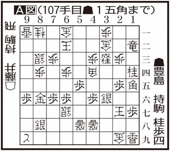 勝負の分かれ目として挙げたいのが107手目▲1五角(A図)の直後。藤井2冠は△1九金と豊島陣の香を取りましたが、ここは△3九飛が有力で以下、先手にも▲3七歩の粘りがあって簡単ではないものの、後手の勝ち筋でした。