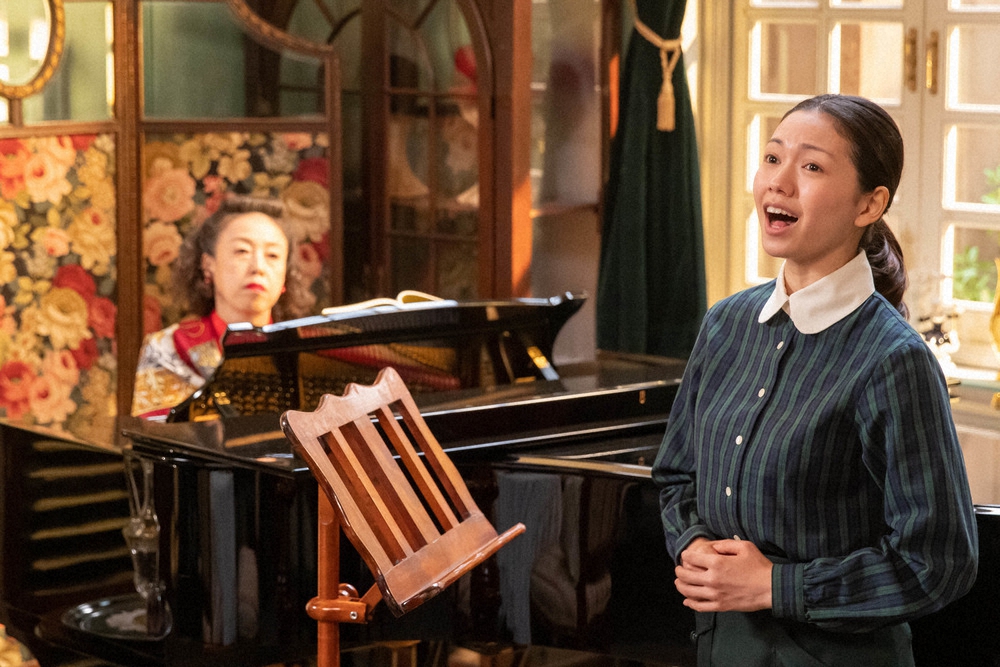 連続テレビ小説「エール」第92話。新しい歌の先生・ベルトーマス羽生(広岡由里子)のレッスンを受ける音(二階堂ふみ・右)(C)NHK