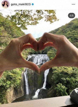 袋田の滝は、恋愛のパワースポットと言われ、流れ落ちる水量によっては、ハートの形に見える岩肌が出現するという。後藤は「滝の中に隠れハートがあるみたいなのでその隠れハート部分をハートで囲ってみたよ」と、“隠れハート”が出現するポイントを中心に撮影した1枚を披露。ハッシュタグでは「肉眼で探すのはつらいよ」と記している。