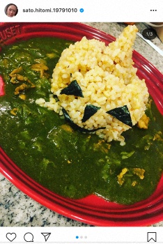佐藤は投稿で「ハロウィン。ほうれん草カレー カボチャがどんどん崩れていくから急いで撮った」とご飯でカボチャをかたどった写真を掲載した。続けてご飯がルウの中に崩れていく連続写真も載せ「駄菓子菓子 見事崩壊 まーこれはこれでアリだ 良き良き」と、納得した様子をつづった。