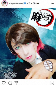 魘夢(えんむ)は、大ヒット公開中の「劇場版 鬼滅の刃 無限列車編」で、主人公・炭治郎たちの前に立ちはだかる鬼。同キャラクターに変身した写真に「麻世の刃」とタイトルを付けてアップし、「大ヒット中の『鬼滅の刃』のコスプレ初挑戦!」と切り出した川崎。