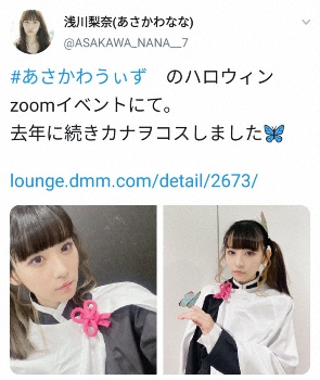 「#あさかわうぃず のハロウィンzoomイベントにて。去年に続きカナヲコスしました」と自身のオンラインコミュニティーで配信イベントを行ったことを報告。サイドテールにチョウの髪飾りを付け、指にもチョウを乗せた隊服姿のソロショットをアップした。