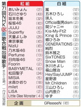 NHKは16日、大みそかの「第71回NHK紅白歌合戦」(後7・30~同11・45)の出場歌手を発表した。オーディション番組を勝ち抜いて誕生した9人組ガールズユニット「NiziU(ニジュー)」のほか、今年ジャニーズ事務所から同時デビューした6人組「SixTONES(ストーンズ)」と9人組「Snow Man」らが初出場を決めた。また、女性アイドルグループ「AKB48」は選出されなかった。