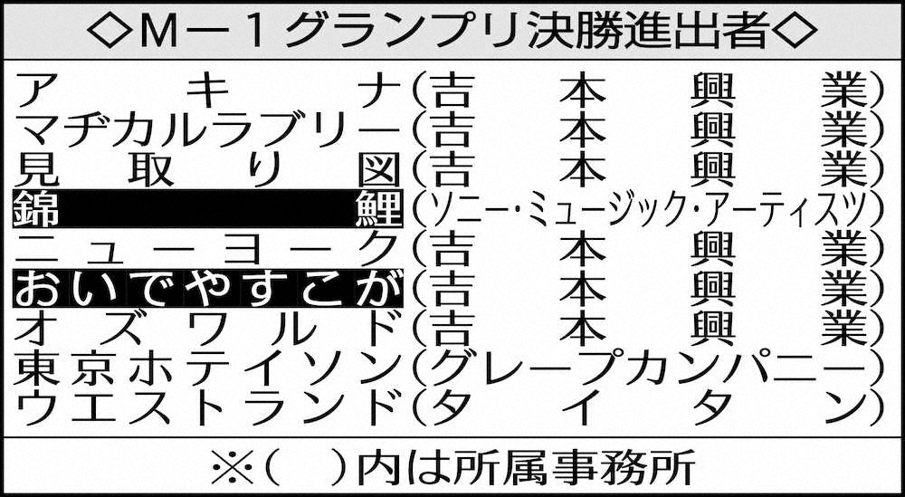「M―1グランプリ」決勝進出を果たした9組(左から)おいでやすこが、錦鯉、アキナ、見取り図、マヂカルラブリー、ニューヨーク、オズワルド、東京ホテイソン、ウエストランド Photo by 提供写真 M―1グランプリ 錦鯉“史上最年長”で初決勝!9組が20日の大一番に臨む ギャラリーで見る この記事のフォト 2020年12月03日の画像一覧 もっと見る 2020年12月03日の画像をもっと見る