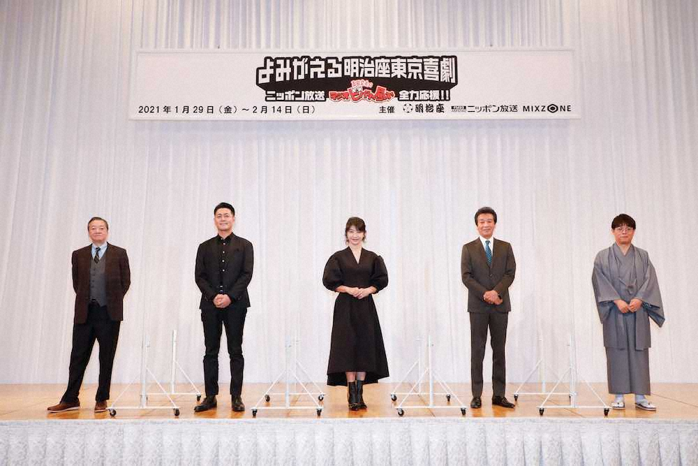 「よみがえる明治座東京喜劇」の製作発表会見に出席した(左から)高田文夫、宅間孝行、田中美佐子、前川清、立川志らく